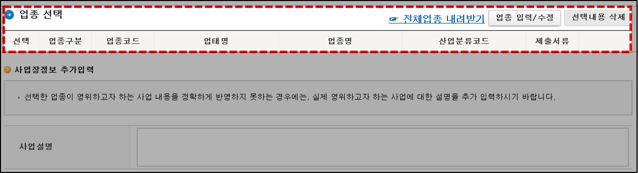 6. 사업자유형이 일반과세자, 간이과세자, 면세사업자 중 하나인 경우 주업종코드를 꼭 입력해주셔야 합니다. 우측에 있는 '업종 입력/수정' 버튼을 클릭하여 하시려는 사업에 맞는 업종코드를 찾아서 입력해주시면 됩니다.