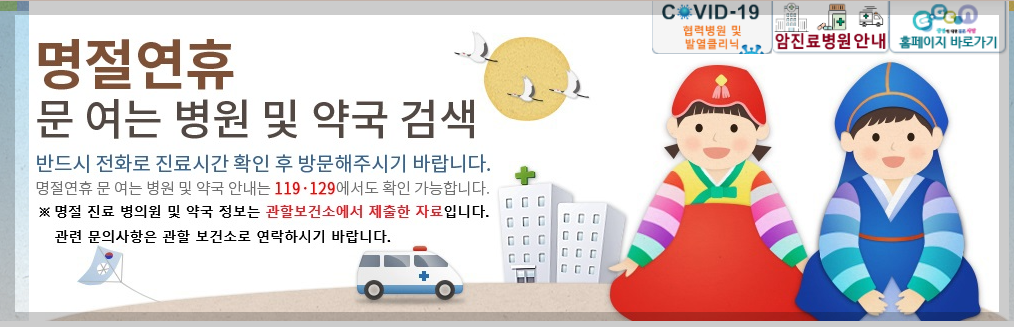 추석연휴 병원찾기 작성자: 트윙클라이프 | 발행일: 2024년 09월 16일 반응형 추석연휴 병원찾기 연휴동안 진료가능 병원조회 바로가기 가까운 응급실 안내 바로가기 추석연휴 가능한 약국 조회 바로가기 반응형 공유하기 게시글 관리 우리 삶을 빛내주는 정보들 저작자표시 비영리 변경금지 (새창열림) 추석연휴 병원찾기 목차